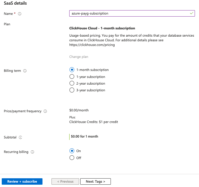 - Note that at this point, you will have subscribed to the Azure subscription of ClickHouse Cloud, but you have not yet set up your account on ClickHouse Cloud. The next steps are necessary and critical for ClickHouse Cloud to be able to bind to your Azure subscription so your billing happens correctly through the Azure marketplace.