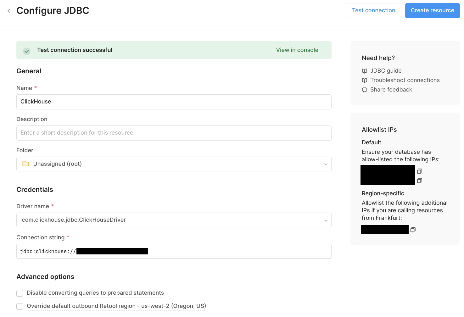 Fill in your ClickHouse credentials in the following format: jdbc:clickhouse://HOST:PORT/DATABASE?user=USERNAME&password=PASSWORD. If your instance requires SSL or you are using ClickHouse Cloud, add &ssl=true to the connection string, so it looks like jdbc:clickhouse://HOST:PORT/DATABASE?user=USERNAME&password=PASSWORD&ssl=true